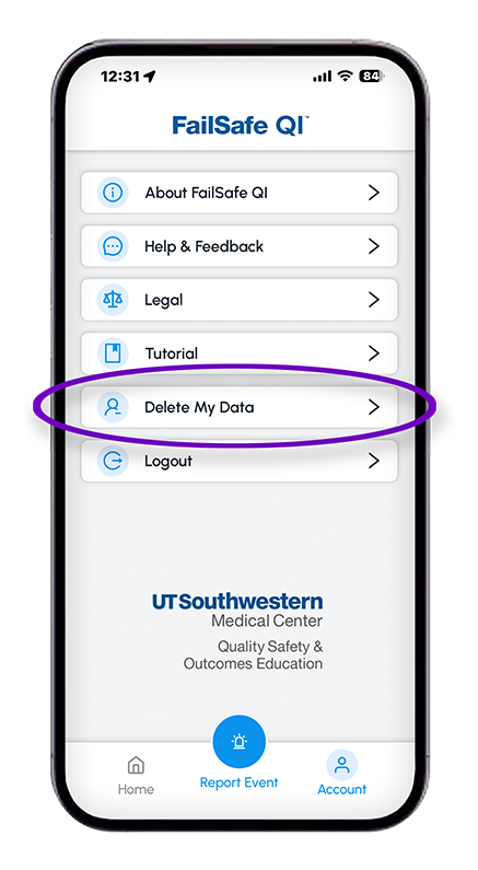 To Delete your data from the secure FailSafe QI app’s server, navigate to the Account screen in the app and select “Delete My Data”. Your login information will be deleted.